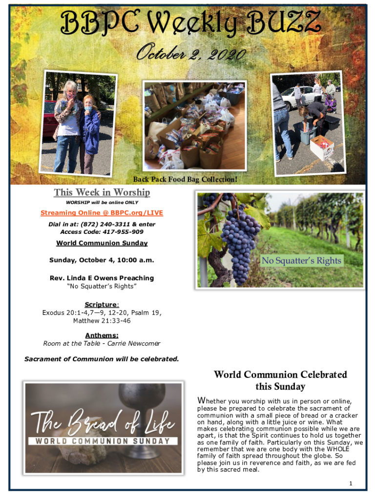 BBC Weekly BUZZ September 06, 2019, December 7, 2018Back Pack Food Bag Collection! This Week in Worship will be online ONLYStreaming Online @ BBPC.org/LIVE Dial in at: (872) 2403311 & enter Access