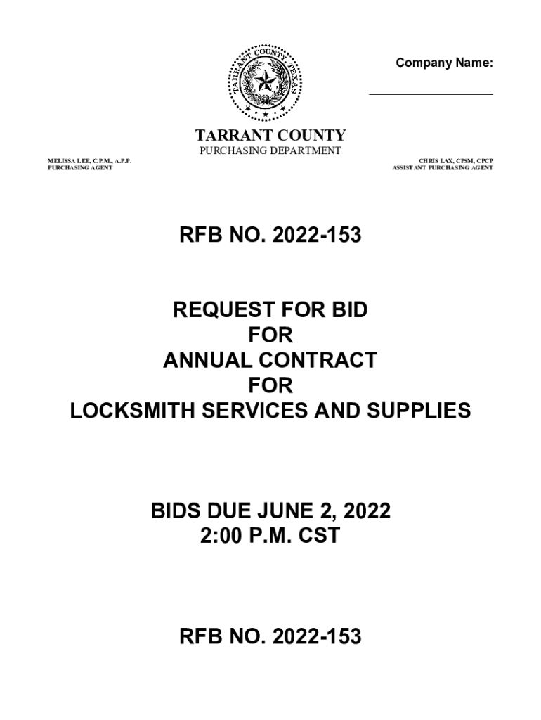 Company Name: ___TARRANT COUNTY MELISSA LEE, C.P.M., A.P.P. PURCHASING AGENTPURCHASING DEPARTMENTCHRIS LAX, CPM, CPC ASSISTANT PURCHASING AGENT NO. 2022153 REQUEST FOR BID FOR ANNUAL CONTRACT FOR