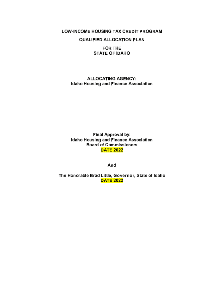 INCOME HOUSING TAX CREDIT PROGRAM QUALIFIED ALLOCATION PLAN FOR THE STATE OF IDAHOALLOCATING AGENCY: Idaho Housing and Finance AssociationFinal Approval by: Idaho Housing and Finance Association Board