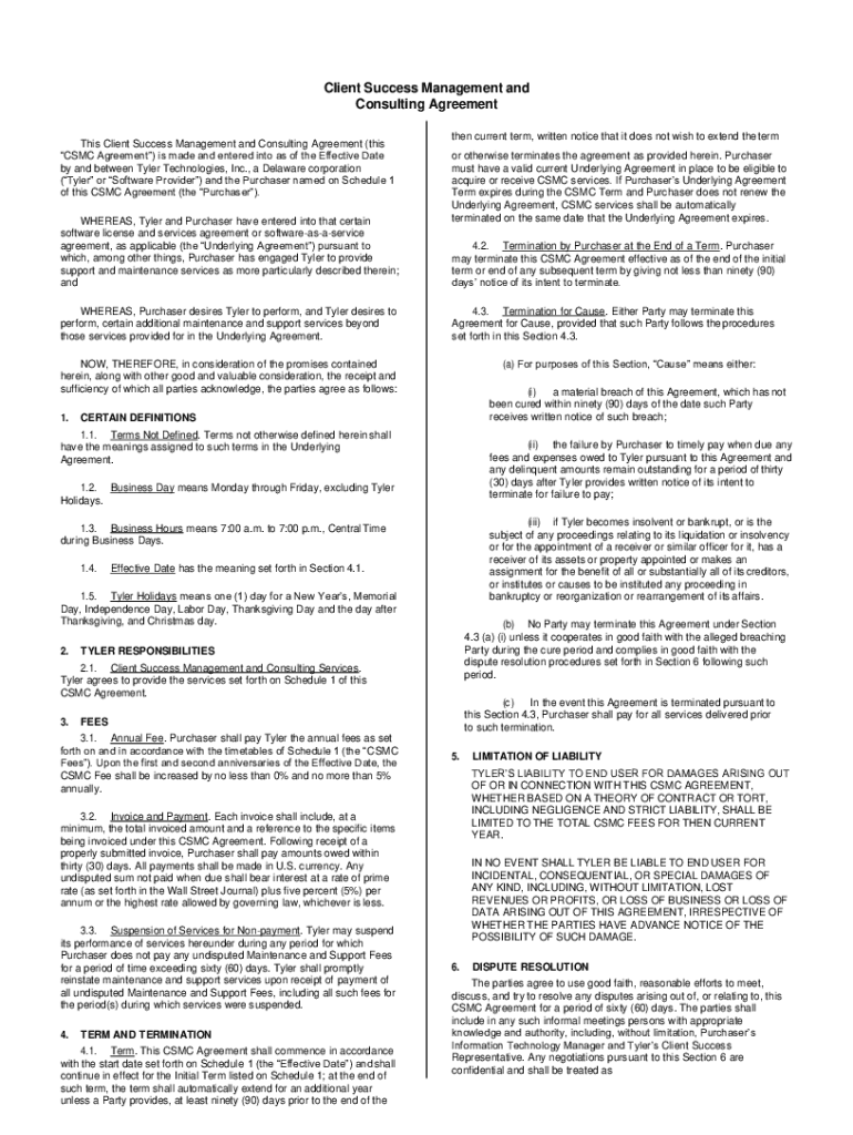 Client Success Management and Consulting Agreement This Client Success Management and Consulting Agreement (this CSC Agreement) is made and entered into as of the Effective Date by and between Tyler