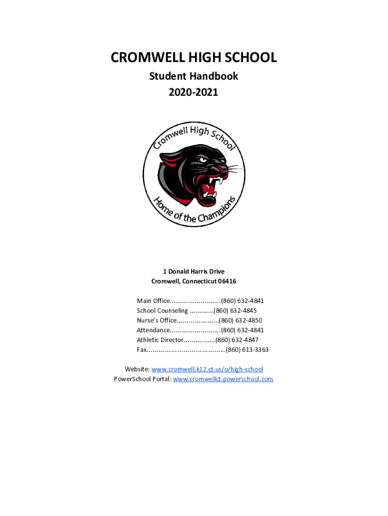CROMWELL HIGH SCHOOL Student Handbook 202020211 Donald Harris Drive Cromwell, Connecticut 06416 Main Office.(860) 6324841 School Counseling ...(860) 6324845 Nurses Office...(860) 6324850 Attendance.(860)