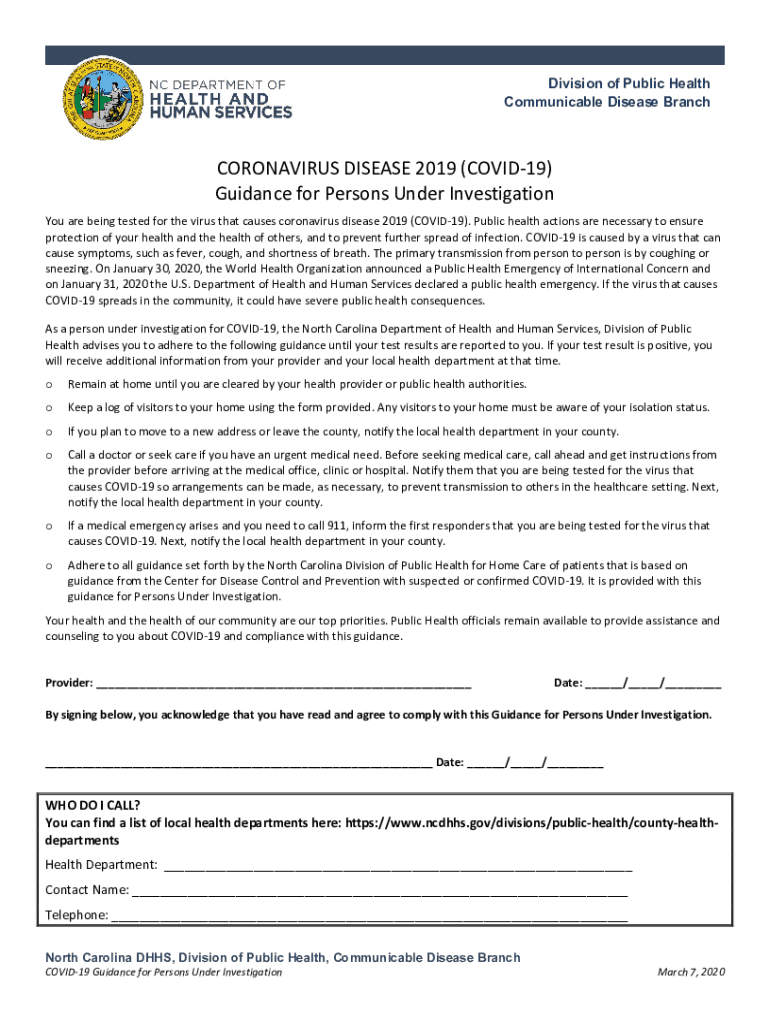 Division of Public Health Communicable Disease BranchCORONAVIRUS DISEASE 2019 (COVID-19) Guidance for Persons Under Investigation You are being tested for the virus that causes coronavirus disease