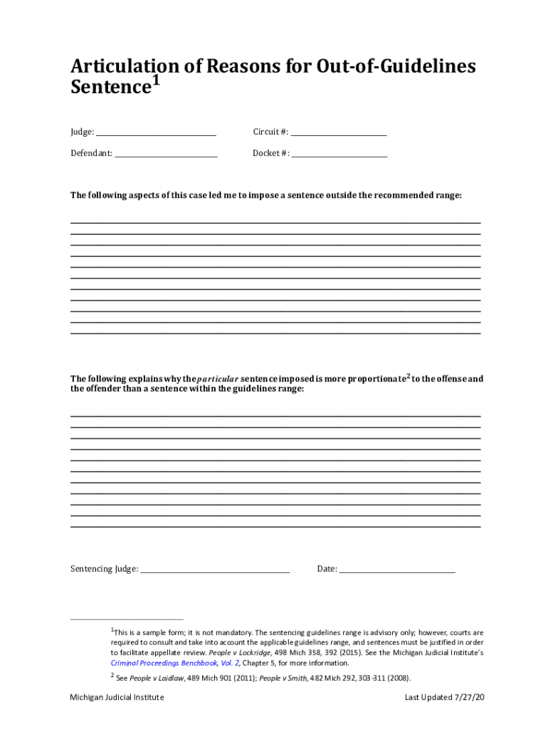 Articulation of Reasons for OutofGuidelinesSentence1 Judge: ___Circuit #: ___Defendant: ___Docket #: ___The following aspects of this case led me to impose a sentence outside the recommended range:___