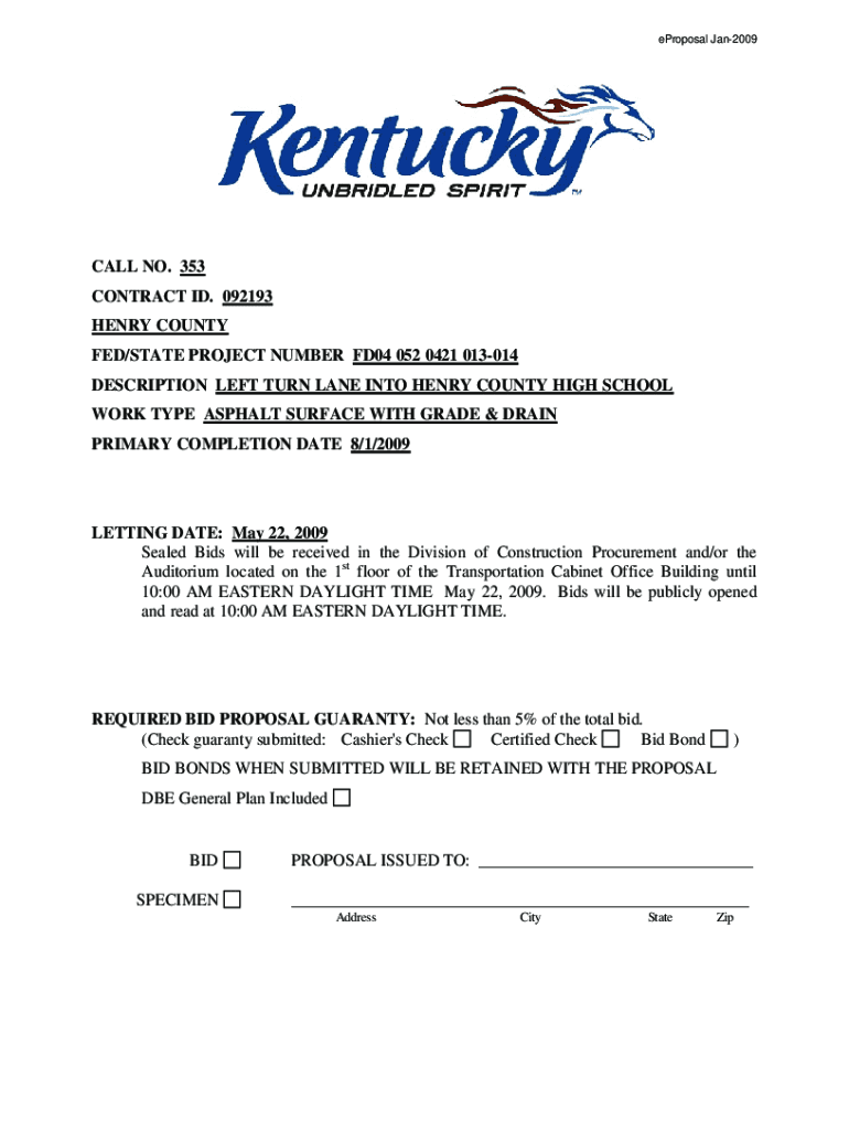 Proposal Jan2009CALL NO. 353 CONTRACT ID. 092193 HENRY COUNTY FED/STATE PROJECT NUMBER FD04 052 0421 013014 DESCRIPTION LEFT TURN LANE INTO HENRY COUNTY HIGH SCHOOL WORK TYPE ASPHALT SURFACE WITH
