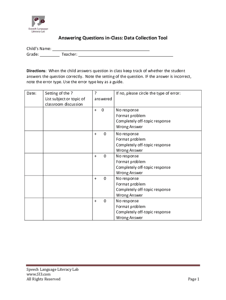Answering Questions class: Data Collection Tool Child's Name: ___ Grade: ___ Teacher: ___Directions: When the child answers question in class keep track of whether the student answers the question