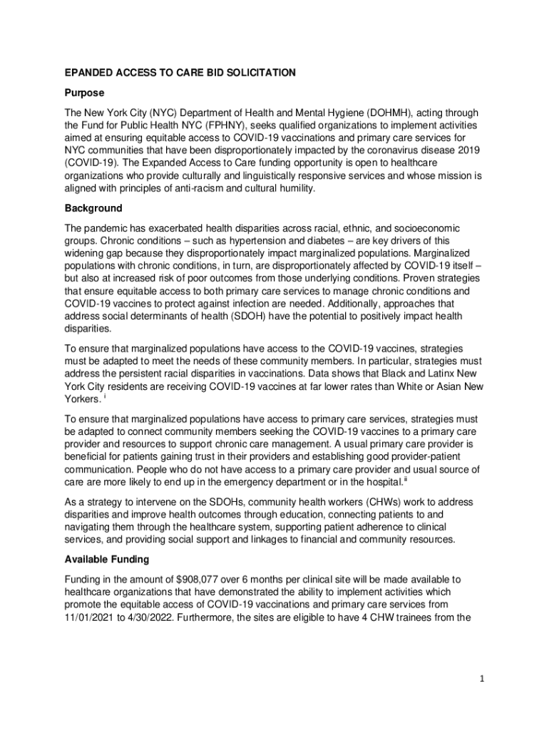 EXPANDED ACCESS TO CARE BID SOLICITATION Purpose The New York City (NYC) Department of Health and Mental Hygiene (DOME), acting through the Fund for Public Health NYC (FPH NY), seeks qualified organizations