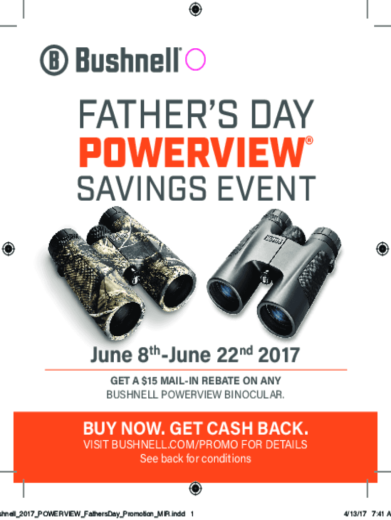 FATHERS DAYPOWERVIEWSAVINGS EVENT June 8thJune 22nd 2017 GET A $15 MAILING REBATE ON ANY BUSHNELL OVERVIEW BINOCULAR.BUY NOW. GET CASH BACK. VISIT BUSHNELL.COM/PROMO FOR DETAILS See back for conditionsshnell_2017_POWERVIEW_FathersDay_Promotion_MIR.