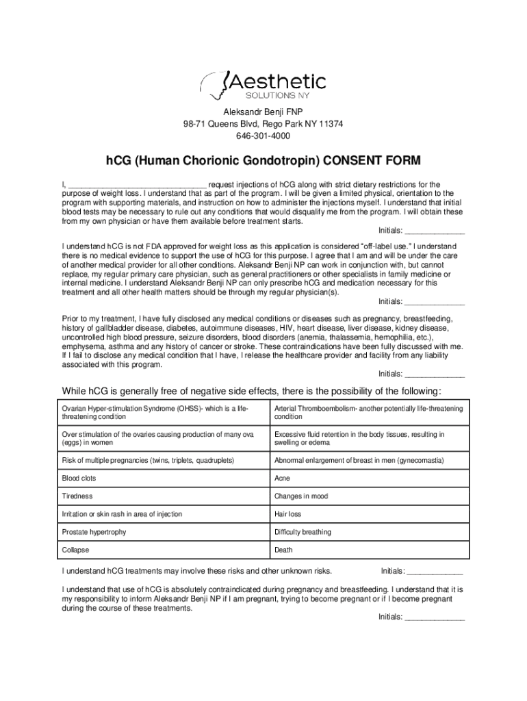 Aleksandr Benji FDP 9871 Queens Blvd, Ego Park NY 11374 6463014000hCG (Human) CONSENT FORM I, ___ request injections of HCG along with strict dietary restrictions for the purpose of weight loss. I