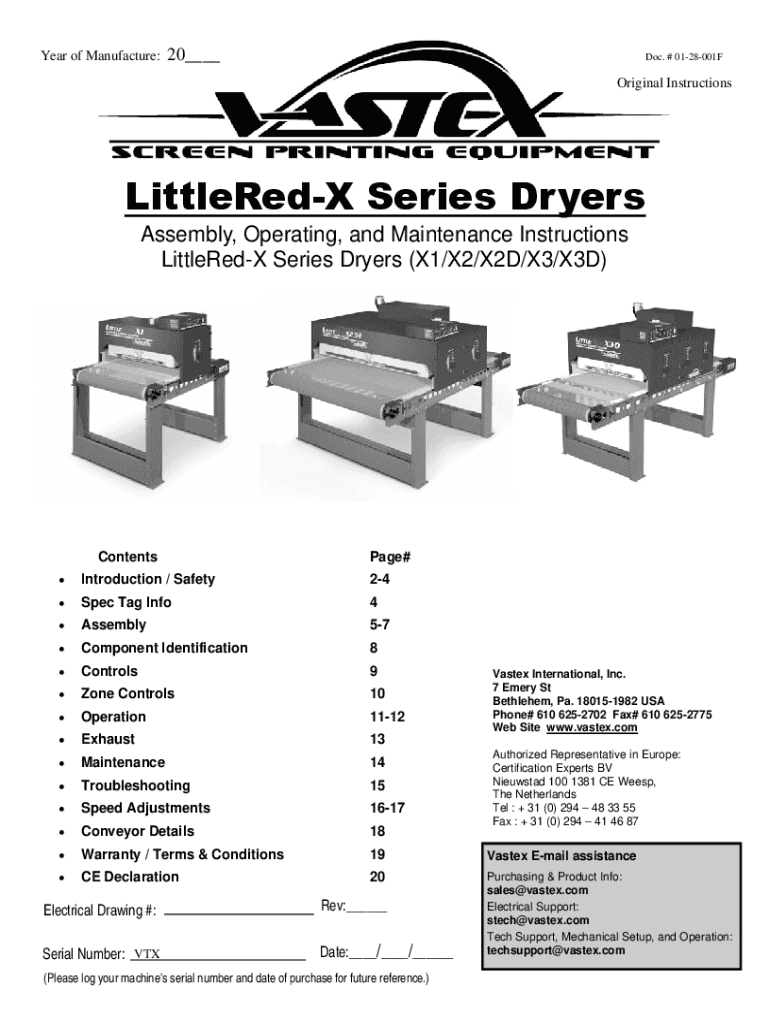 Year of Manufacture:20___Doc. # 0128001FOriginal InstructionsLittleRedX Series Dryers Assembly, Operating, and Maintenance Instructions Littered Series Dryers (X1/X2/X2D/X3/X3D)Contents Page#Introduction