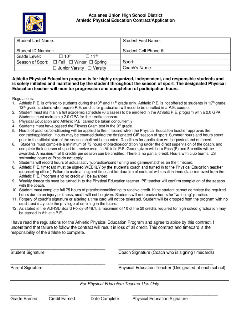Abalones Union High School District Athletic Physical Education Contract/ApplicationStudent Last Name:Student First Name:Student ID Number: Grade Level: 10th 11th Season of Sport: Fall Winter Spring