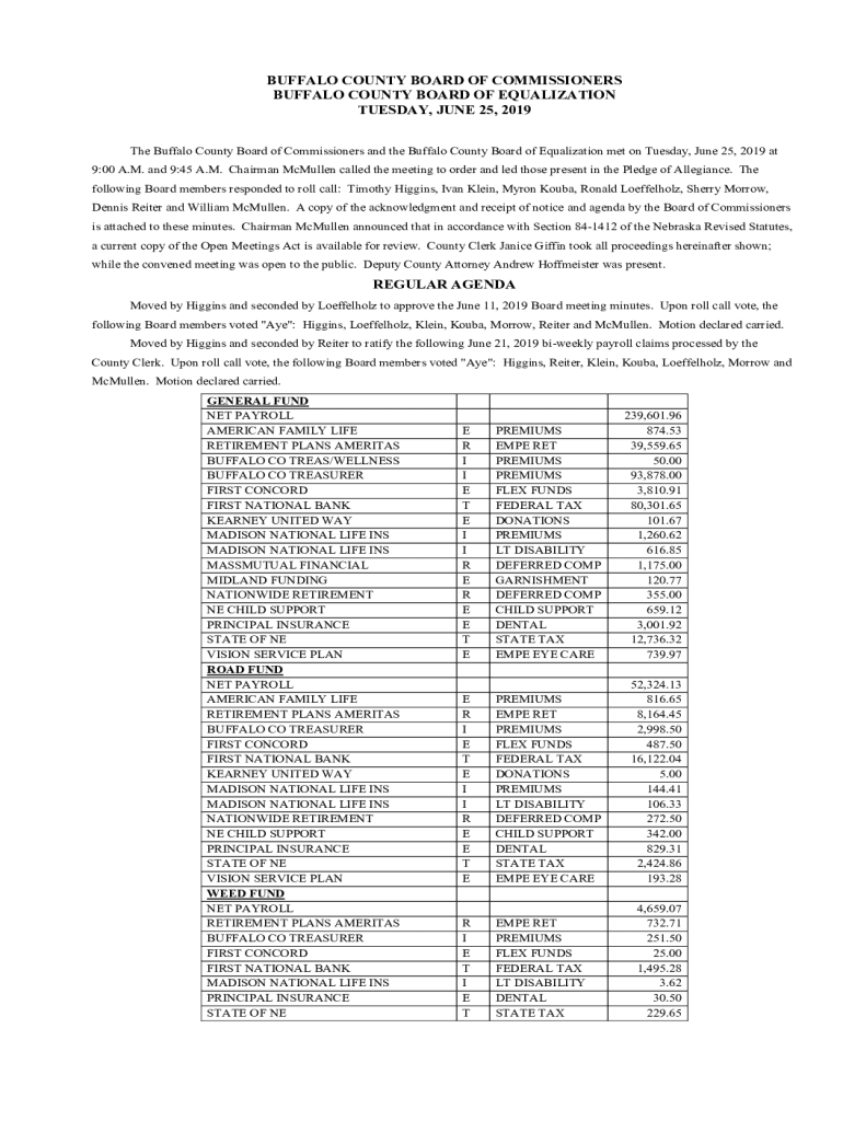 BUFFALO COUNTY BOARD OF COMMISSIONERS BUFFALO COUNTY BOARD OF EQUALIZATION TUESDAY, JUNE 25, 2019, The Buffalo County Board of Commissioners and the Buffalo County Board of Equalization met on Tuesday,
