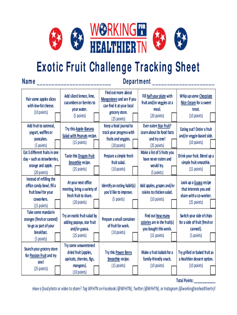 Exotic Fruit Challenge Tracking Sheet Name ___ Pair some apples slices with low fat cheese. (10 points) Add fruit to oatmeal, yogurt, waffles or pancakes. (5 points) Eat 3 different fruits in one