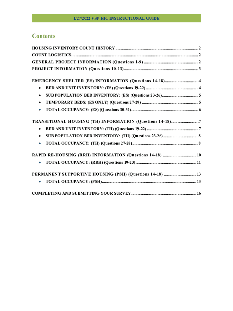 1/27/2022 VSP HIC INSTRUCTIONAL GUIDEContents HOUSING INVENTORY COUNT HISTORY ............................................................................... 2 COUNT LOGISTICS .........................................................................................................................