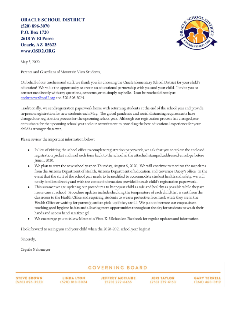 ORACLE SCHOOL DISTRICT (520) 8963070 P.O. Box 1720 2618 W El Pasco Oracle, AZ 85623 www.OSD2.ORG May 5, 2020, Parents and Guardians of Mountain Vista Students, On behalf of our teachers and staff,