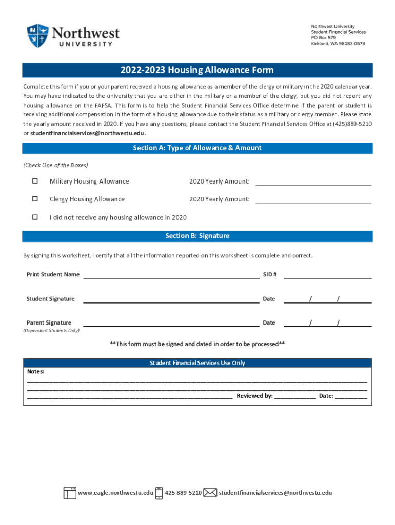 20222023 Housing Allowance Form Complete this form if you or your parent received a housing allowance as a member of the clergy or military in the 2020 calendar year. You may have indicated to the