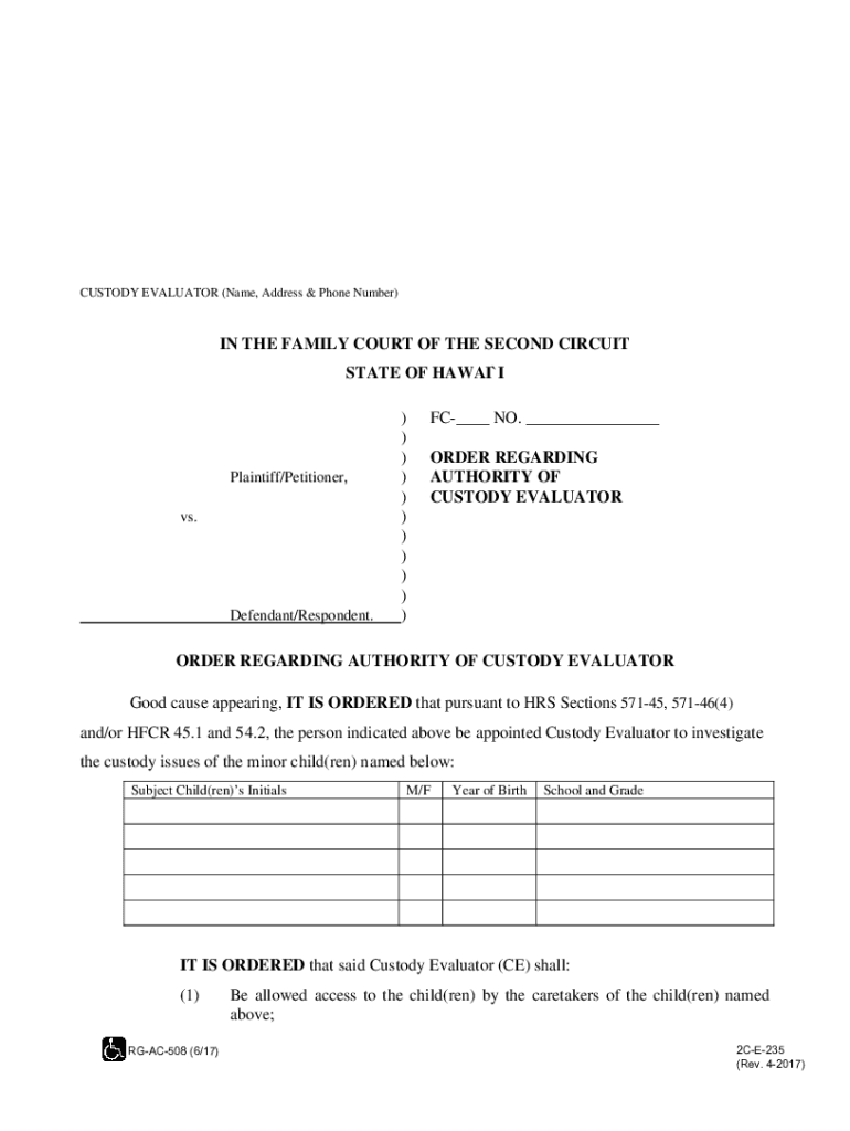 CUSTODY EVALUATOR (Name, Address & Phone Number)IN THE FAMILY COURT OF THE SECOND CIRCUITSTATE OF HAWAII`Plaintiff/Petitioner, vs. Defendant/Respondent.) ))))))))))FC___ NO. ___ ORDER REGARDING AUTHORITY