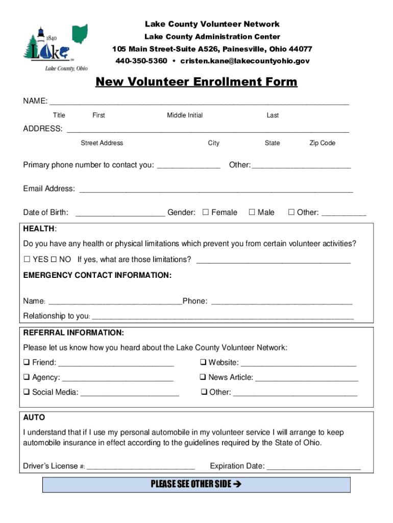 Lake County Volunteer Network Lake County Administration Center 105 Main Streetwise A526, Painesville, Ohio 44077 4403505360 cristen.kane@lakecountyohio.govNew Volunteer Enrollment Form NAME: ___