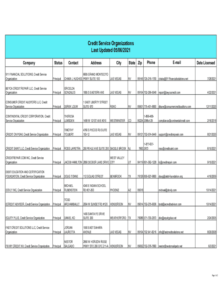Credit Service Organizations Last Updated 05/06/2021 CompanyStatusContactAddressCityState ZipPhoneEmailDate Licensed911 FINANCIAL SOLUTIONS, Credit Service OrganizationPrincipal6605 GRAND MONTEVIDEO