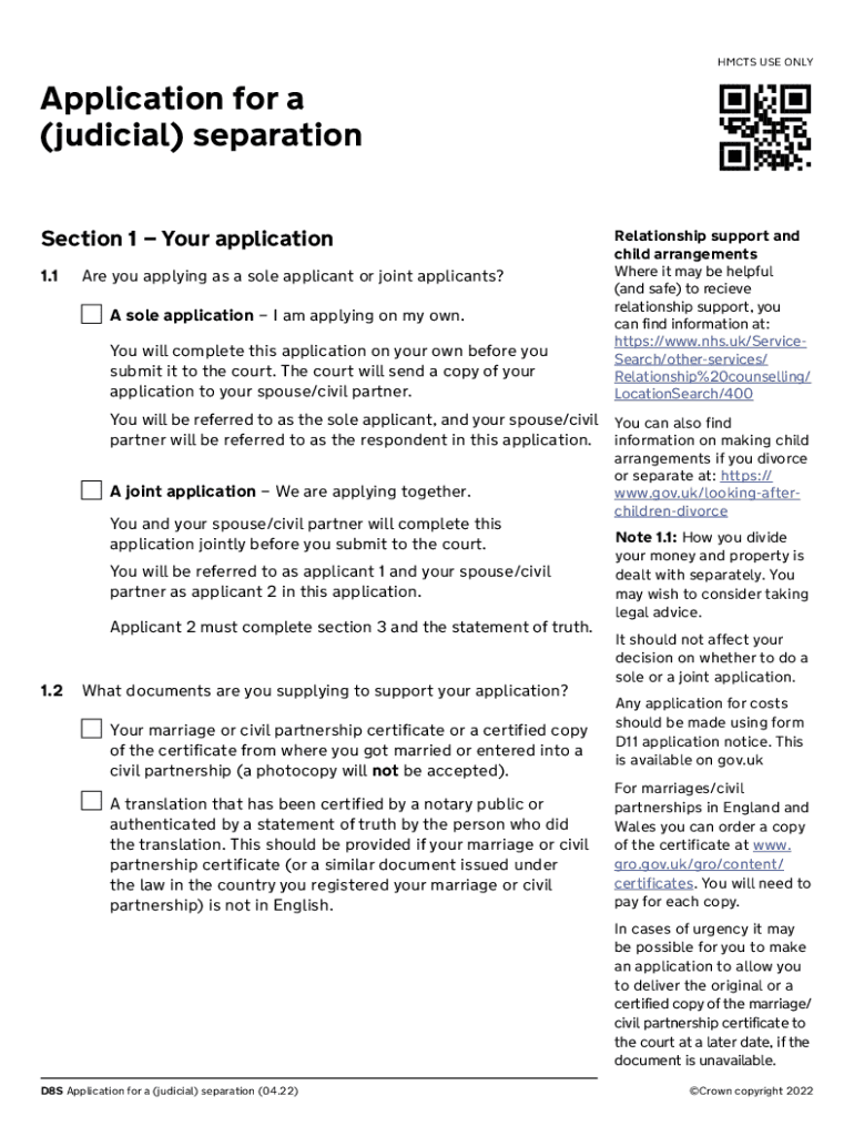 MCTS USE ONLYApplication for a (judicial) separation Section 1 Your application 1.1Are you applying as a sole applicant or joint applicants? A sole application I am applying on my own. You will complete