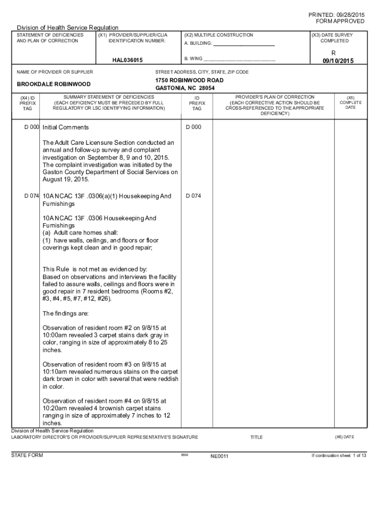 PRINTED: 09/28/2015 FORM APPROVEDDivision of Health Service Regulation STATEMENT OF DEFICIENCIES AND PLAN OF CORRECTION(X1) PROVIDER/SUPPLIER/CIA IDENTIFICATION NUMBER:(X2) MULTIPLE CONSTRUCTION A.