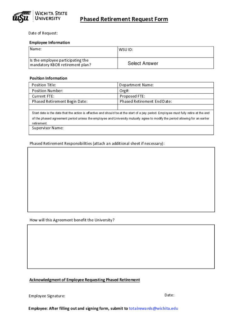Phased Retirement Request Form Date of Request: Employee Information Name: Is the employee participating the mandatory KBR retirement plan?WSU ID:Select Interposition Information Position Title: Position