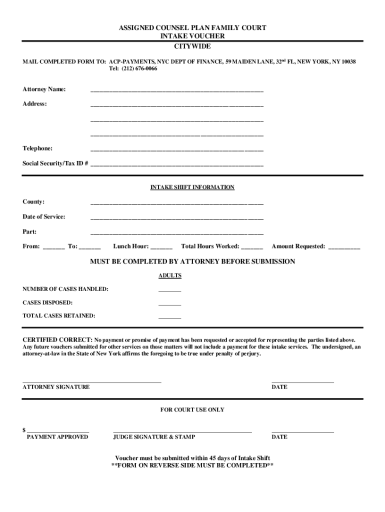ASSIGNED COUNSEL PLAN FAMILY COURT INTAKE VOUCHER CITYWIDE MAIL COMPLETED FORM TO: PAYMENTS, NYC DEPT OF FINANCE, 59 MAIDEN LANE, 32nd FL, NEW YORK, NY 10038 Tel: (212) 6760066Attorney Name:___Address:___