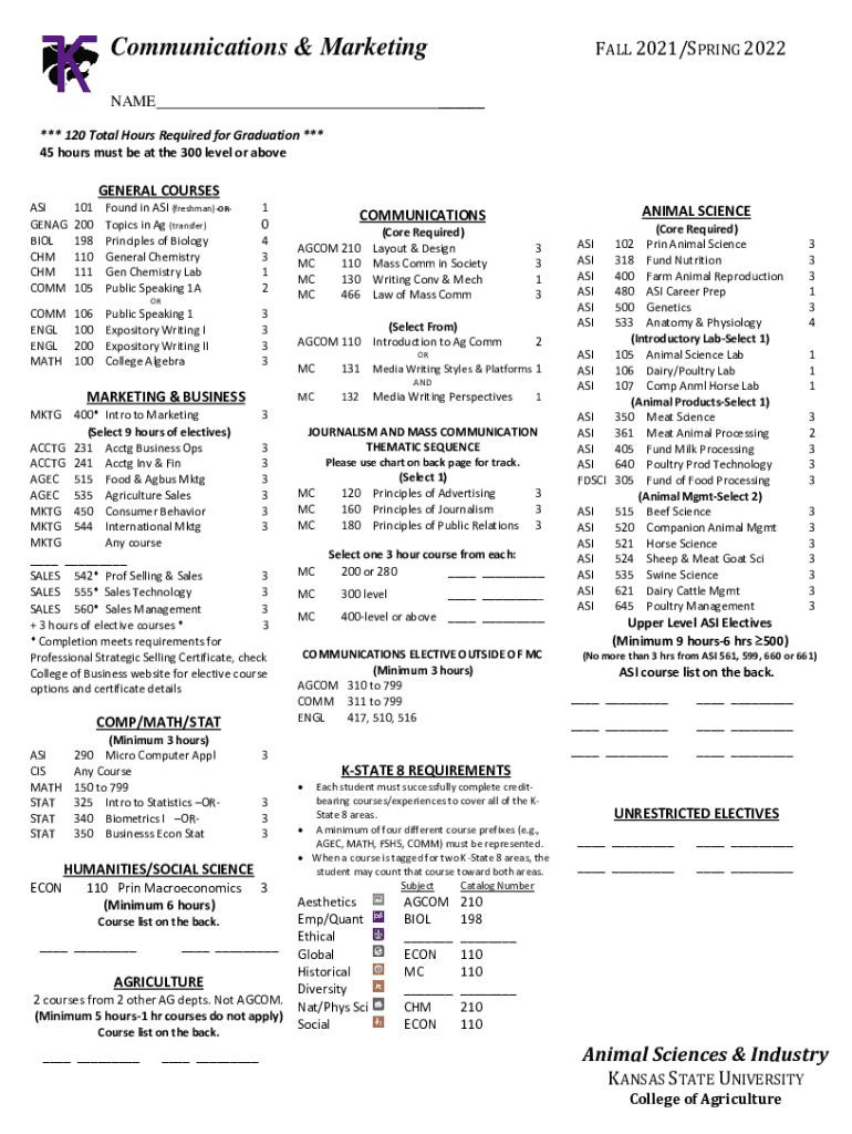 FALL 2021/SPRING 2022Communications & Marketing NAME___ J*** 120 Total Hours Required for Graduation *** 45 hours must be at the 300 level or aboveGENERAL COURSES AS GENA BIOL CHM COMM101 200 198