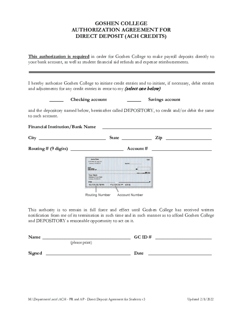 Get the free PDF Direct Deposit Agreement for Students v3 - Goshen College