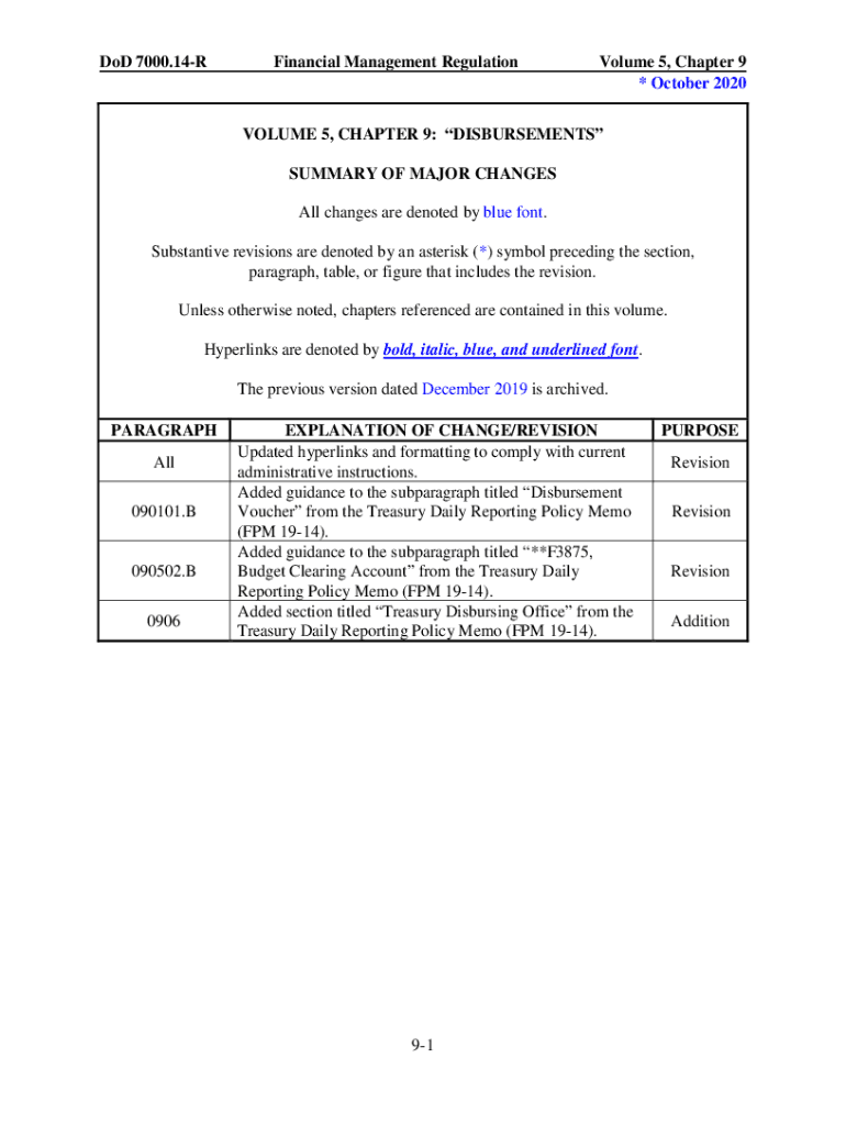 DoD 7000.14R 2BFinancial Management RegulationVolume 5, Chapter 9 * October 2020VOLUME 5, CHAPTER 9: DISBURSEMENTS SUMMARY OF MAJOR CHANGES All changes are denoted by blue font. Substantive revisions