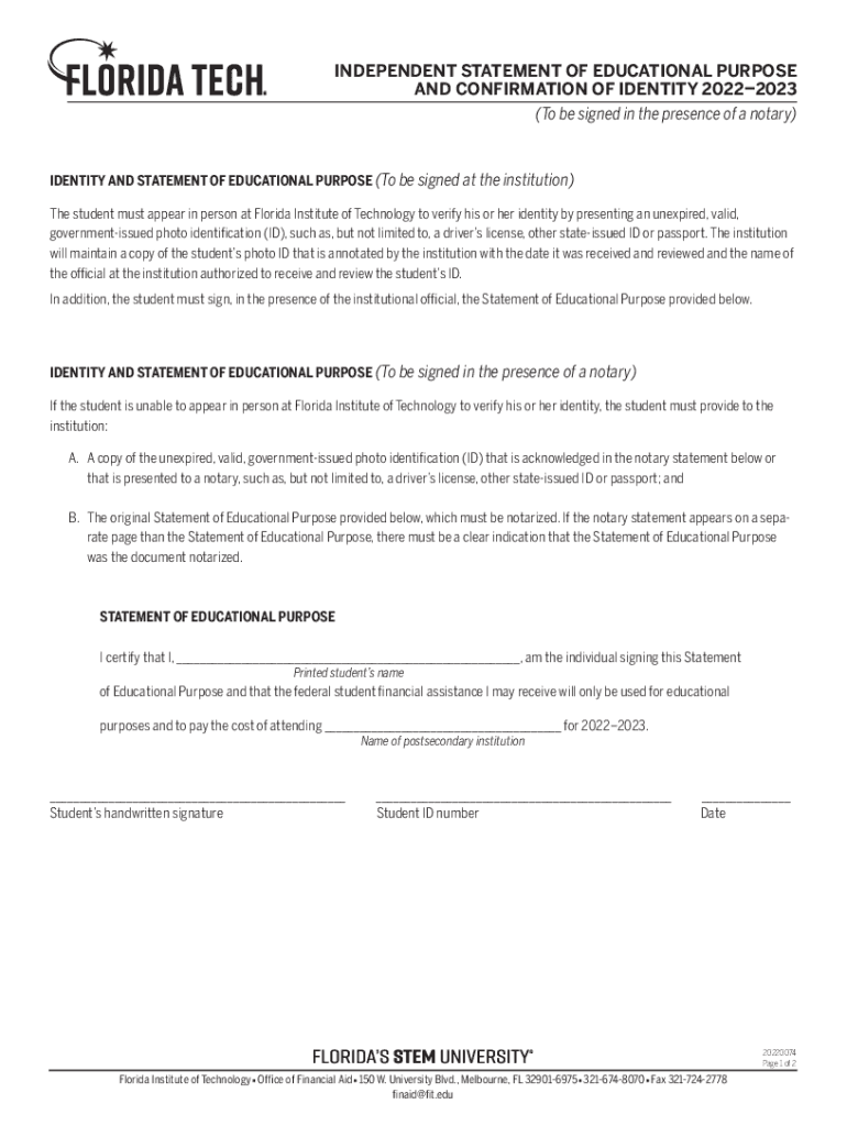 INDEPENDENT STATEMENT OF EDUCATIONAL PURPOSE AND CONFIRMATION OF IDENTITY 20222023 (To be signed in the presence of a notary)IDENTITY AND STATEMENT OF EDUCATIONAL PURPOSE (To be signed at the institution)