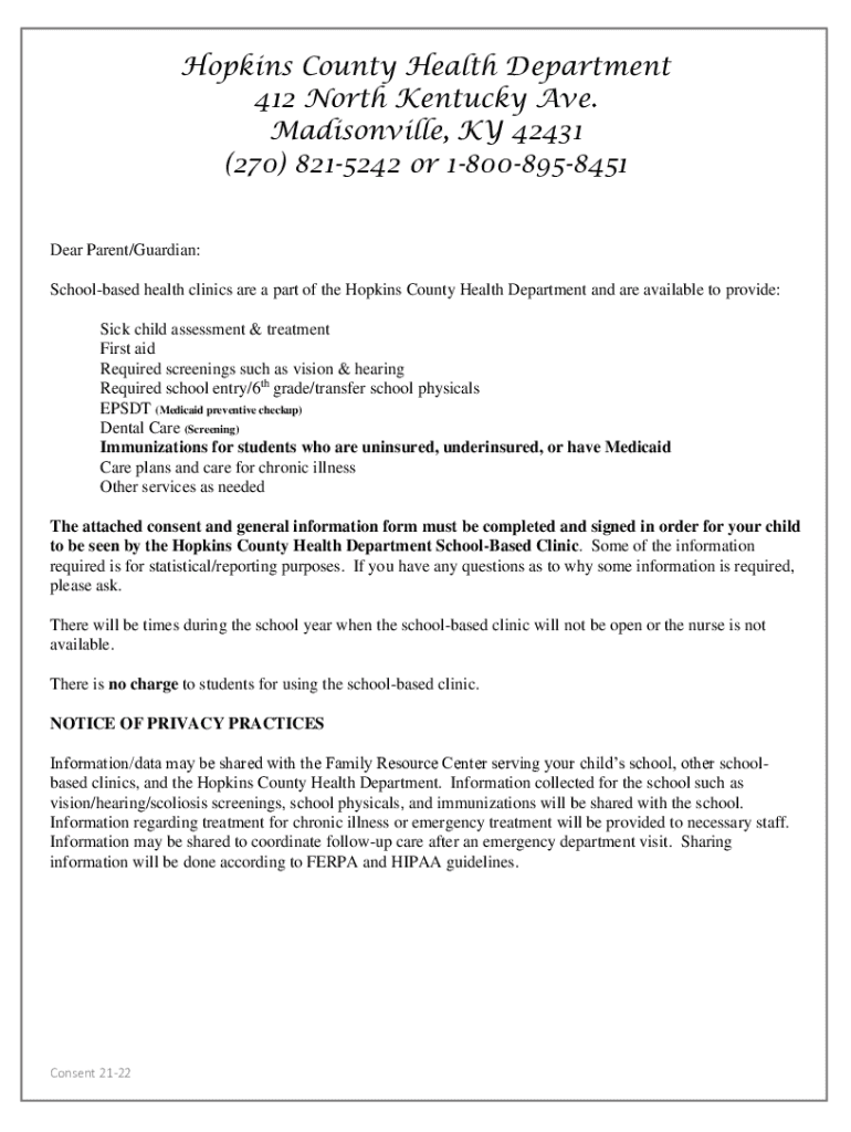 Hopkins County Health Department 412 North Kentucky Ave. Jacksonville, KY 42431 (270) 8215242 or 18008958451 Dear Parent/Guardian: School based health clinics are a part of the Hopkins County Health