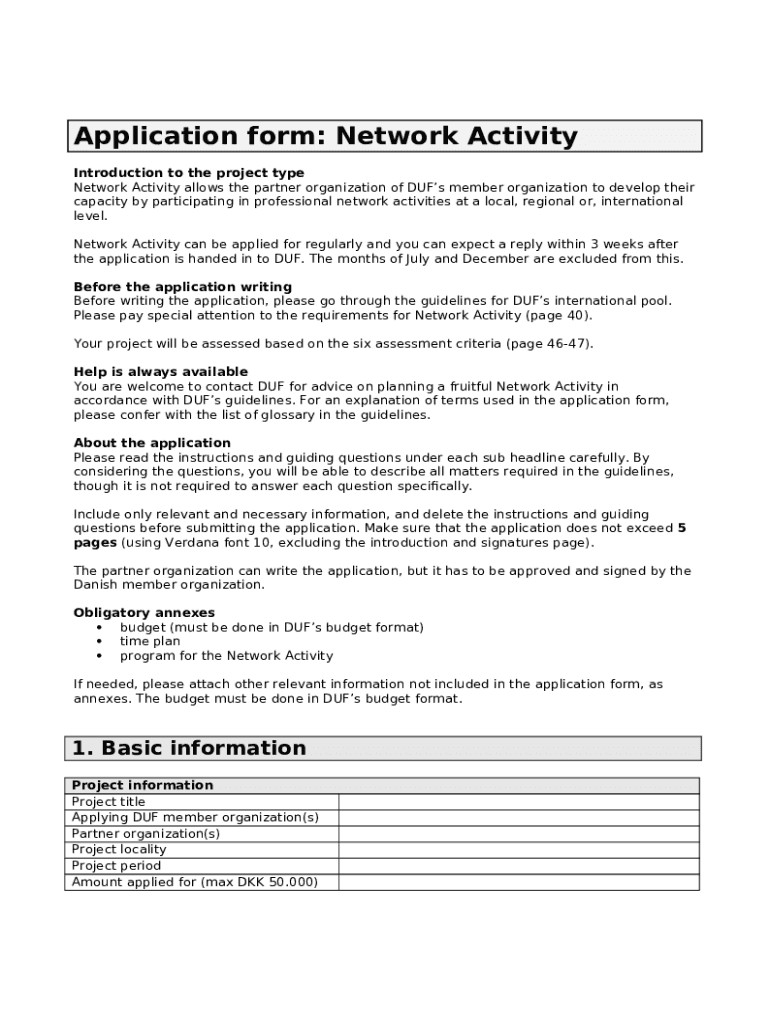 The Application : Partnership project - Dansk is a Word document which can be completed and signed for certain reasons. Then, it is furnished to the actual addressee to provide some info of certain kinds. The completion and signing is available in hard copy by hand or using an appropriate application like PDFfiller. Such tools help to fill out any PDF or Word file without printing them out. While doing that, you can edit it according to your requirements and put a valid digital signature. Once you're good, you send the Application : Partnership project - Dansk to the respective recipient or several ones by email and even fax. PDFfiller provides a feature and options that make your Word template printable. It has a number of settings for printing out. It doesn't matter how you file a document - physically or by email - it will always look neat and firm. To not to create a new writable document from scratch every time, turn the original Word file into a template. After that, you will have a customizable sample.