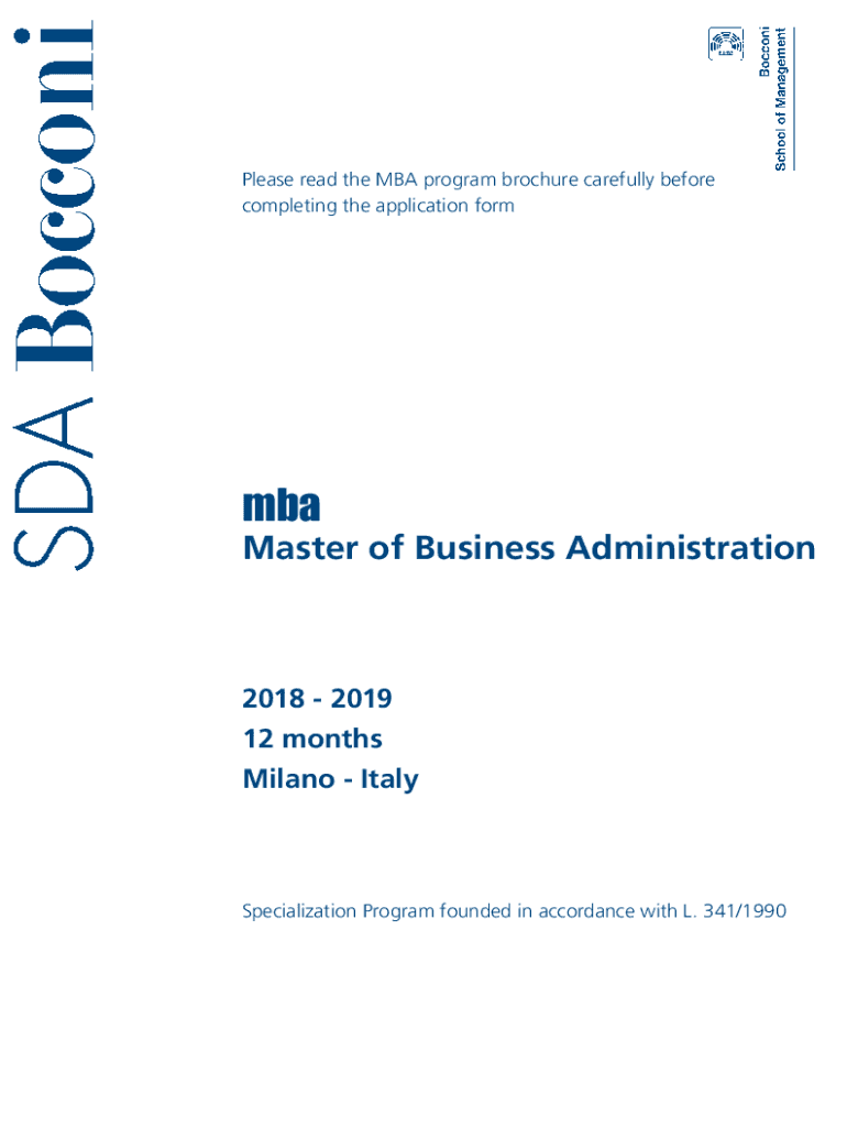 Please read the MBA program brochure carefully before completing the application formmbaMaster of Business Administration2018 2019 12 months Milano ItalySpecialization Program founded in accordance