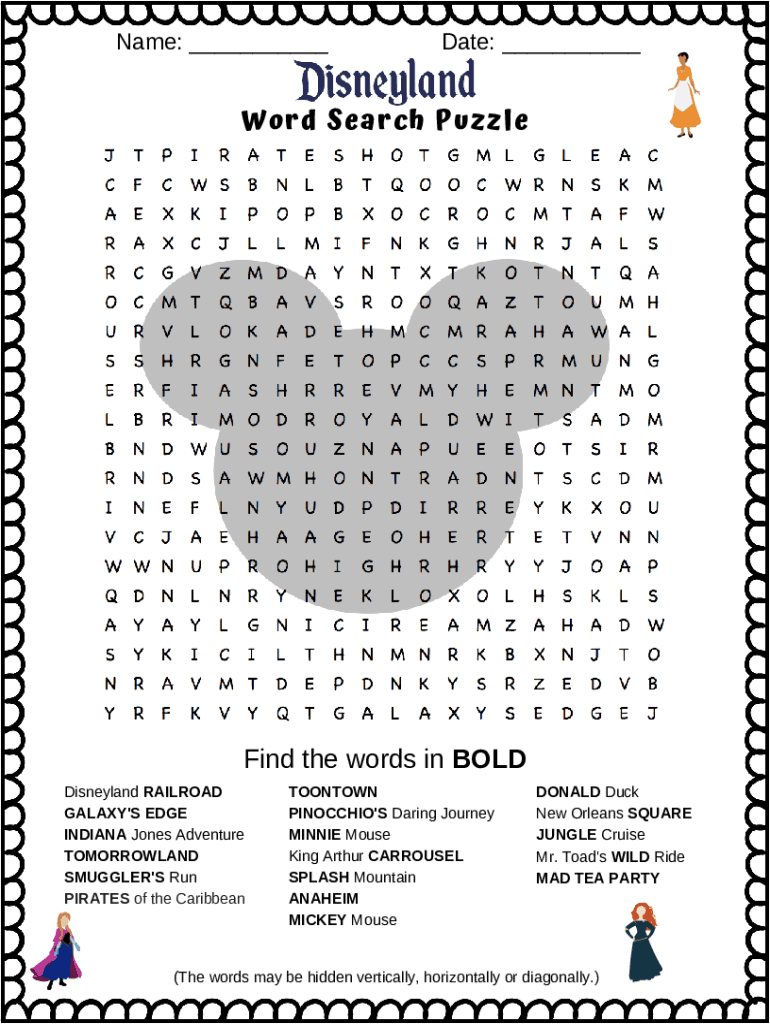 Name: ___Date: ___Word Search Puzzled the words in BOLD Disneyland RAILROAD GALAXY\'S EDGE Indiana Jones Adventure TOMORROWLAND SMUGGLER\'S Run PIRATES of the CaribbeanTOONTOWN PINOCCHIO\'S Daring