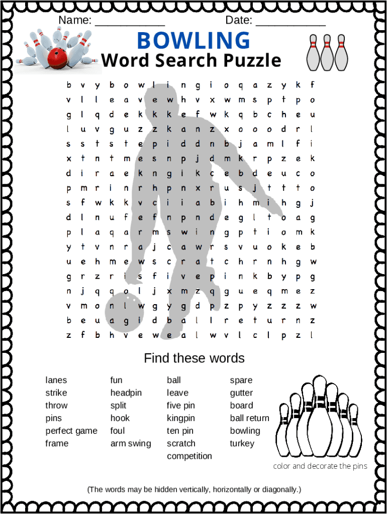 Name: ___Date: ___Collingwood Search Puzzled these words lanes strike throw pins perfect game frame fun headpin split hook foul arm swing ball leave five pin kingpin ten pin scratch competition spare