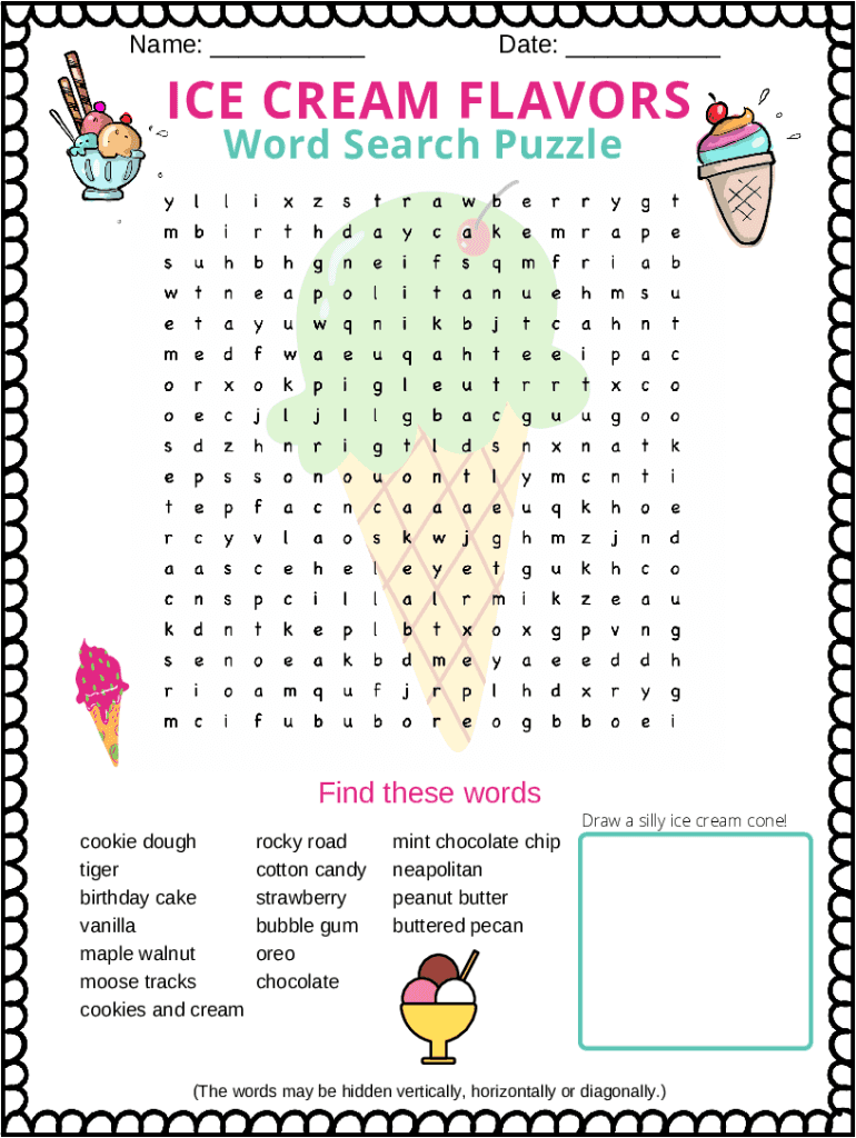 Name: ___Date: ___ICE CREAM FLAVORS Word Search Puzzled these words' cookie dough tiger birthday cake vanilla maple walnut moose tracks cookies and cream rocky road cotton candy strawberry bubble