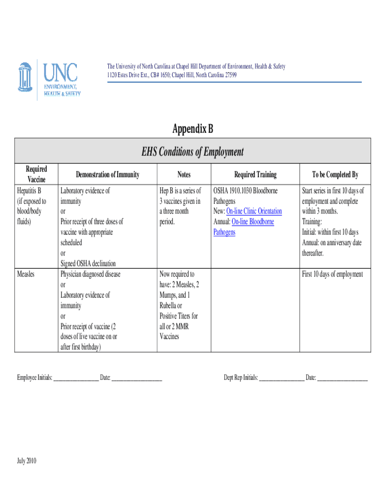The University of North Carolina at Chapel Hill Department of Environment, Health & Safety 1120 Estes Drive Ext., CB# 1650; Chapel Hill, North Carolina 27599AppendixB EHS Conditions of Employment