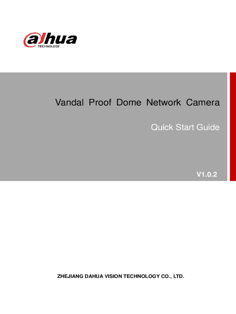 Vandal Proof Dome Network Camera Quick Start GuideV1.0.2ZHEJIANG DATA VISION TECHNOLOGY CO., LTD. Foreword General This manual introduces the functions, installation and operations of the camera.