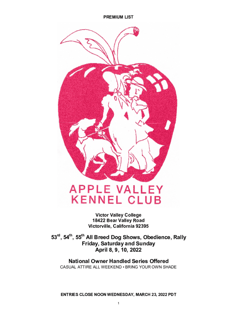 PREMIUM LIST Victor Valley College 18422 Bear Valley Road Victorville, California 9239553rd, 54th, 55th All Breed Dog Shows, Obedience, Rally Friday, Saturday and Sunday, April 8, 9, 10, 2022 National