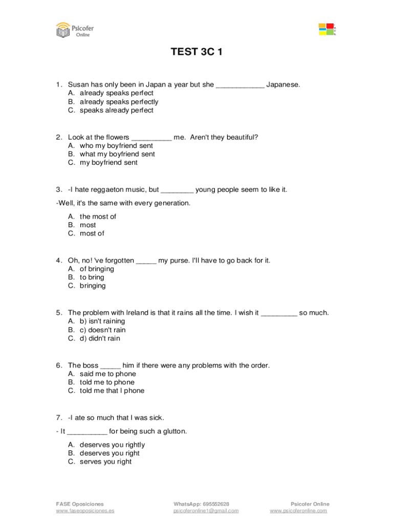 TEST 3C 1 1. Susan has only been in Japan a year but she ___ Japanese. A. already speaks perfect B. already speaks perfectly C. speaks already perfect2. Look at the flowers ___ me. Aren't\'t they