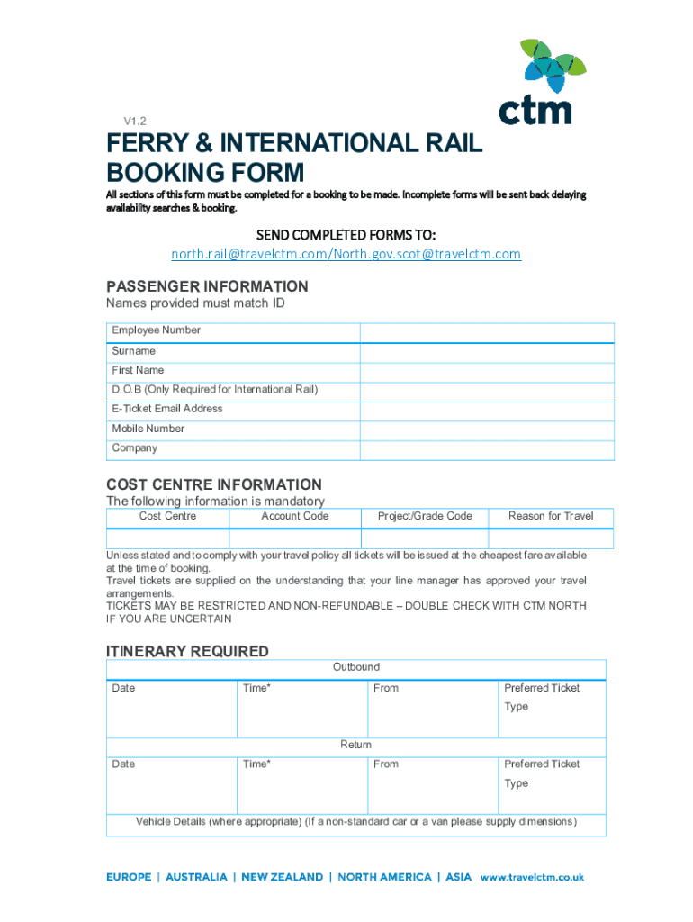 V1.2FERRY & INTERNATIONAL RAIL BOOKING FORM All sections of this form must be completed for a booking to be made. Incomplete forms will be sent back delaying availability searches & booking. SEND