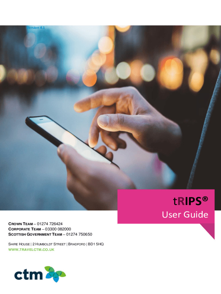 Version 4.1tRIPS User Guide CROWN TEAM 01274 726424 CORPORATE TEAM 03300 082000 SCOTTISH GOVERNMENT TEAM 01274 750650 SHIRE Houses | 2 HUMBOLDT STREET | BRADFORD | BD1 5HQ WWW.TRAVEL CTM.CO.UKCHContents