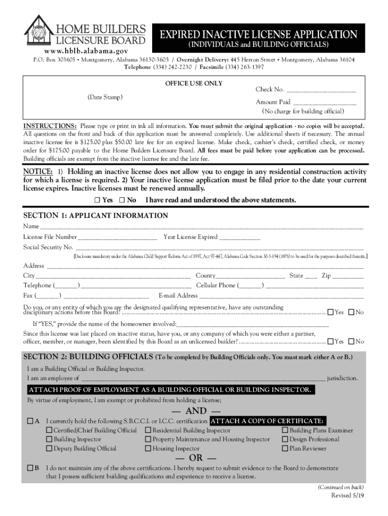 EXPIRED INACTIVE LICENSE APPLICATION (INDIVIDUALS and BUILDING OFFICIALS)www.hblb.alabama.gov P.O. Box 303605Montgomery, Alabama 361303605 / Overnight Delivery: 445 Heron Street Telephone (334) 2422230