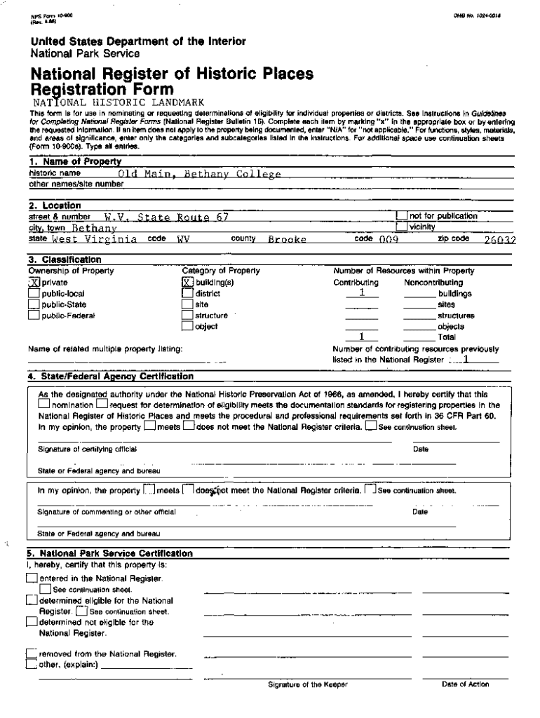 NFS Perm 10900 (RV. 886)OMB No. 1024401BUnited States Department of the Interior National Park Services form is for use in nominating or requesting determinations of eligibility for individual properties
