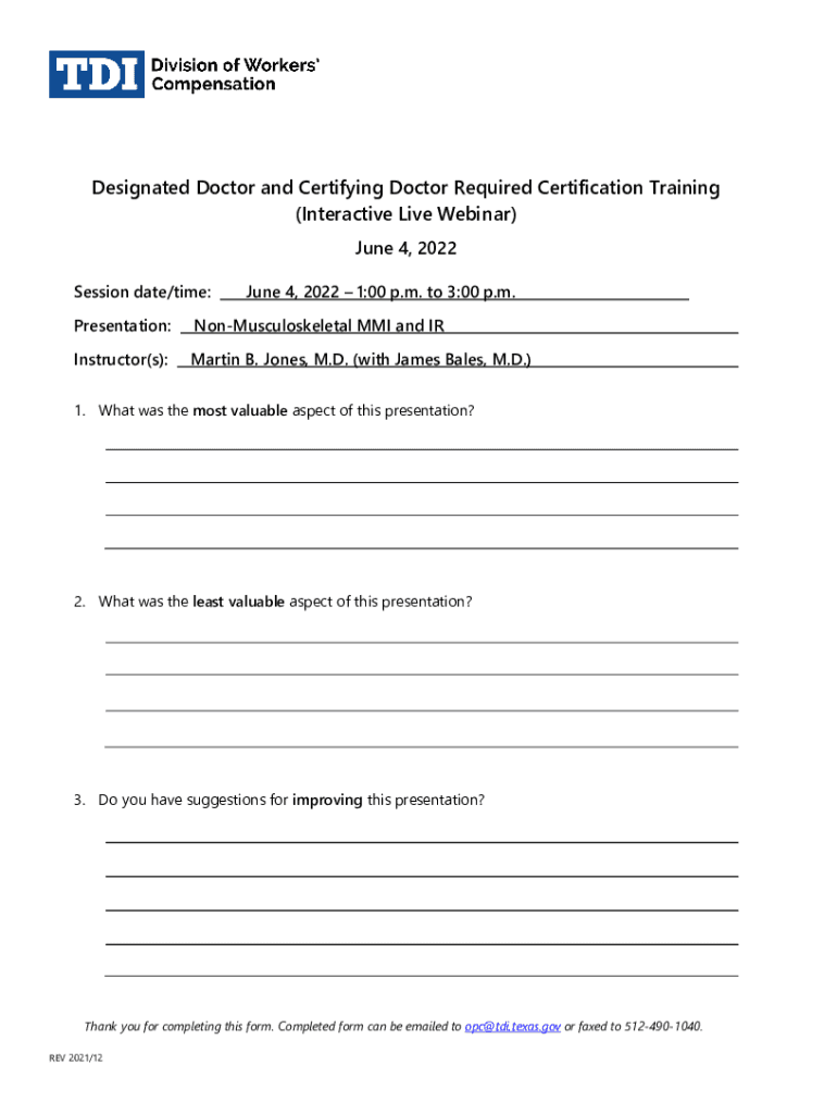 Designated Doctor and Certifying Doctor Required Certification Training (Interactive Live Webinar) June 4, 2022, Session date/time:June 4, 2022 1:00 p.m. to 3:00 p.m. Presentation:Musculoskeletal