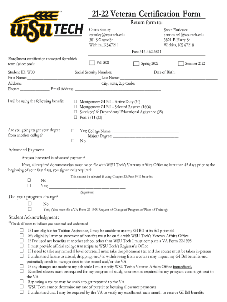 2122 Veteran Certification Form Return form to:Charts Stanley cstanley@wsutech.edu 301 S Grove St Wichita, KS 67211Steve Enriquez senriquez1@wsutech.edu 3821 E Harry St Wichita, KS 67218 Fax: 3164625811Enrollment
