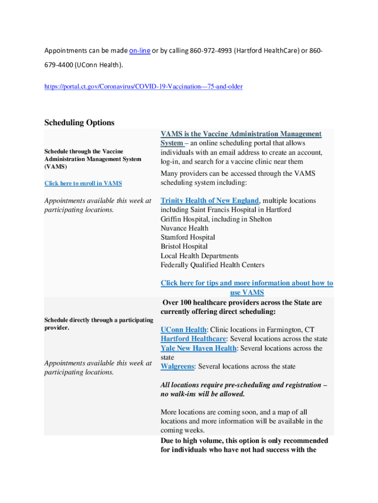 Appointments can be made online or by calling 8609724993 (Hartford Healthcare) or 8606794400 (Conn Health). https://portal.ct.gov/Coronavirus/COVID19Vaccination75andolderScheduling OptionsSchedule