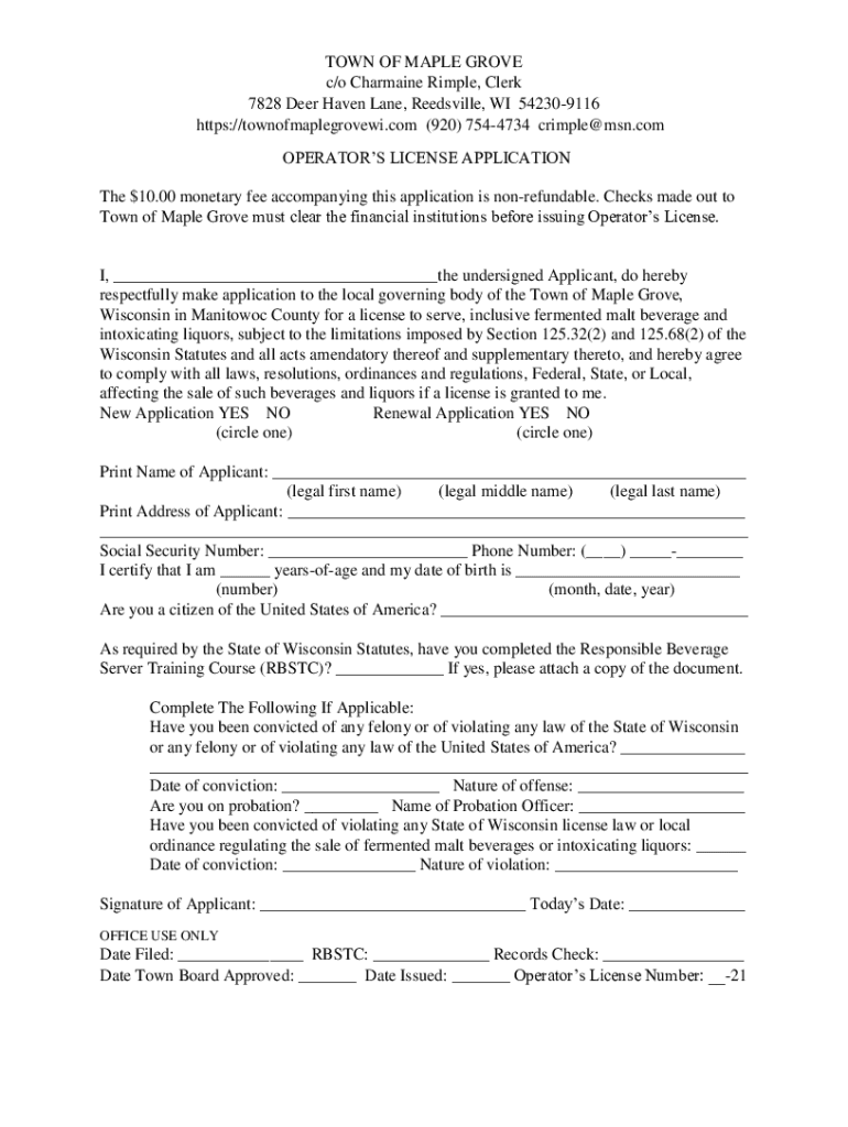 TOWN OF MAPLE GROVE c/o Charmaine Simple, Clerk 7828 Deer Haven Lane, Reidsville, WI 542309116 https://townofmaplegrovewi.com (920) 7544734 crimple@msn.com OPERATORS LICENSE APPLICATION The $10.00