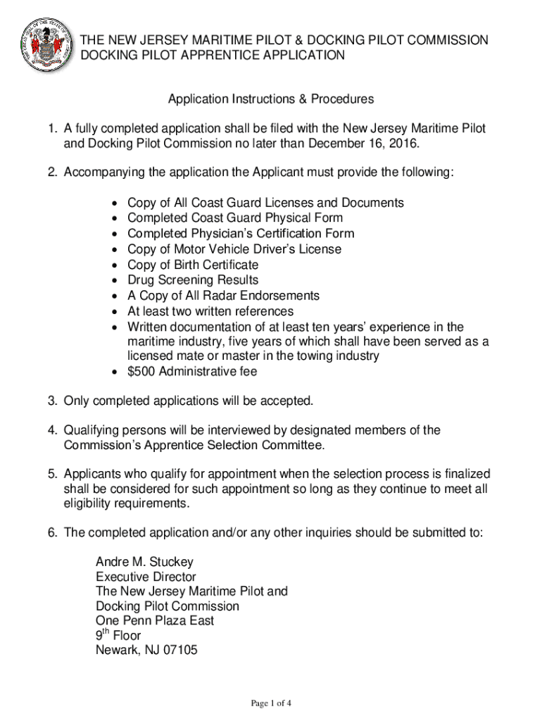 1.THE NEW JERSEY MARITIME PILOT & DOCKING PILOT COMMISSION DOCKING PILOT APPRENTICE APPLICATIONApplication Instructions & Procedures 1. A fully completed application shall be filed with the New Jersey