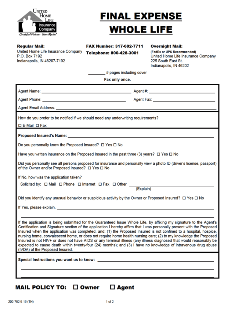 PLEASE DETACH AND GIVE TO APPLICANT If you do not receive your Policy within 60 days from the date of your application, please write to UNITED HOME LIFE INSURANCE COMPANY, P.O. Box 7192, Indianapolis,